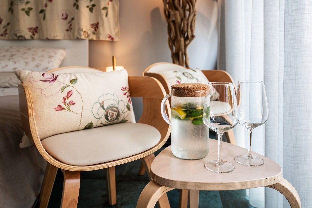 Das Zimmer wurde so gestaltet, dass es dem Gast ein immersives Naturerlebnis bietet, das aus Holzaccessoires, Farben, Stoffen und Dekorationen besteht, die die Elemente der umgebenden Landschaft widerspiegeln.